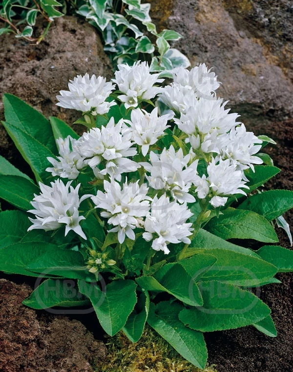 A Campanula glomerata (csomós harangvirág) "fehér" változatai, mint a 'White', fehér virágokkal rendelkeznek, amelyek tömött, gömbölyű fürtökben nyílnak a szárak végén. Ezek a fajták népszerűek a hosszú virágzási idejük miatt.