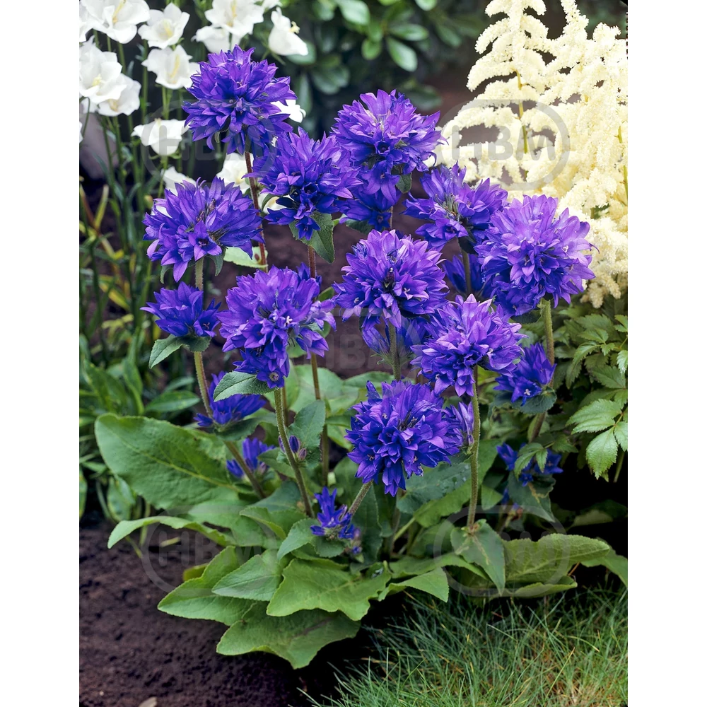A Campanula glomerata (csomós harangvirág) "kék" változatai, mint a 'Superba' vagy a 'Genti Blue', élénk, sötét ibolyakék virágokkal rendelkeznek, amelyek tömött, gömbölyű fürtökben nyílnak a szárak végén. Ezek a fajták népszerűek a mély színük és a hosszú virágzási idejük miatt.