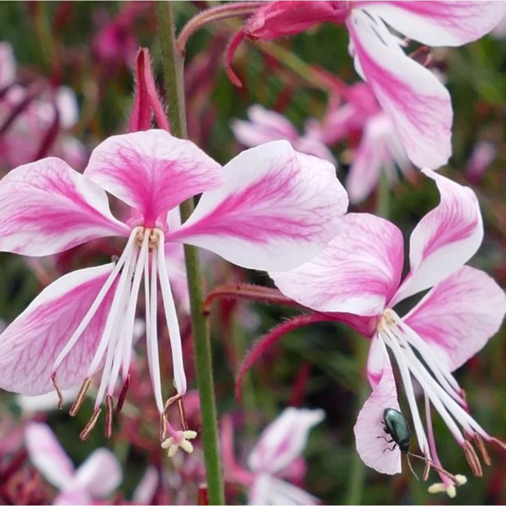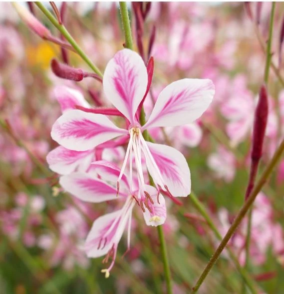 Virágzás: Május végétől vagy június elejétől egészen az őszi fagyokig (októberig) folyamatosan és bőségesen virágzik. A virágok mély bordó rügyekből nyílnak, rózsaszínűek, és a szélben finoman "lebegnek".