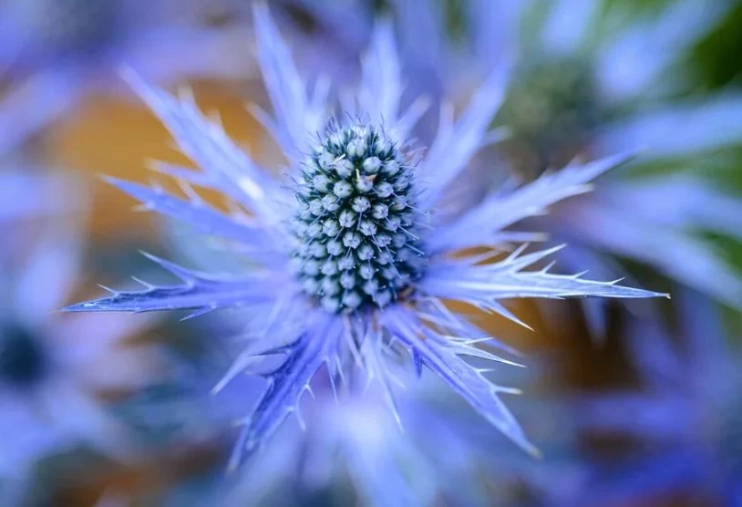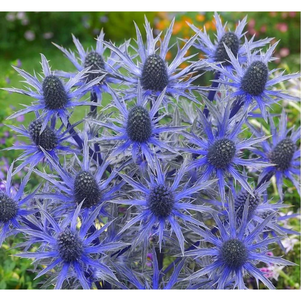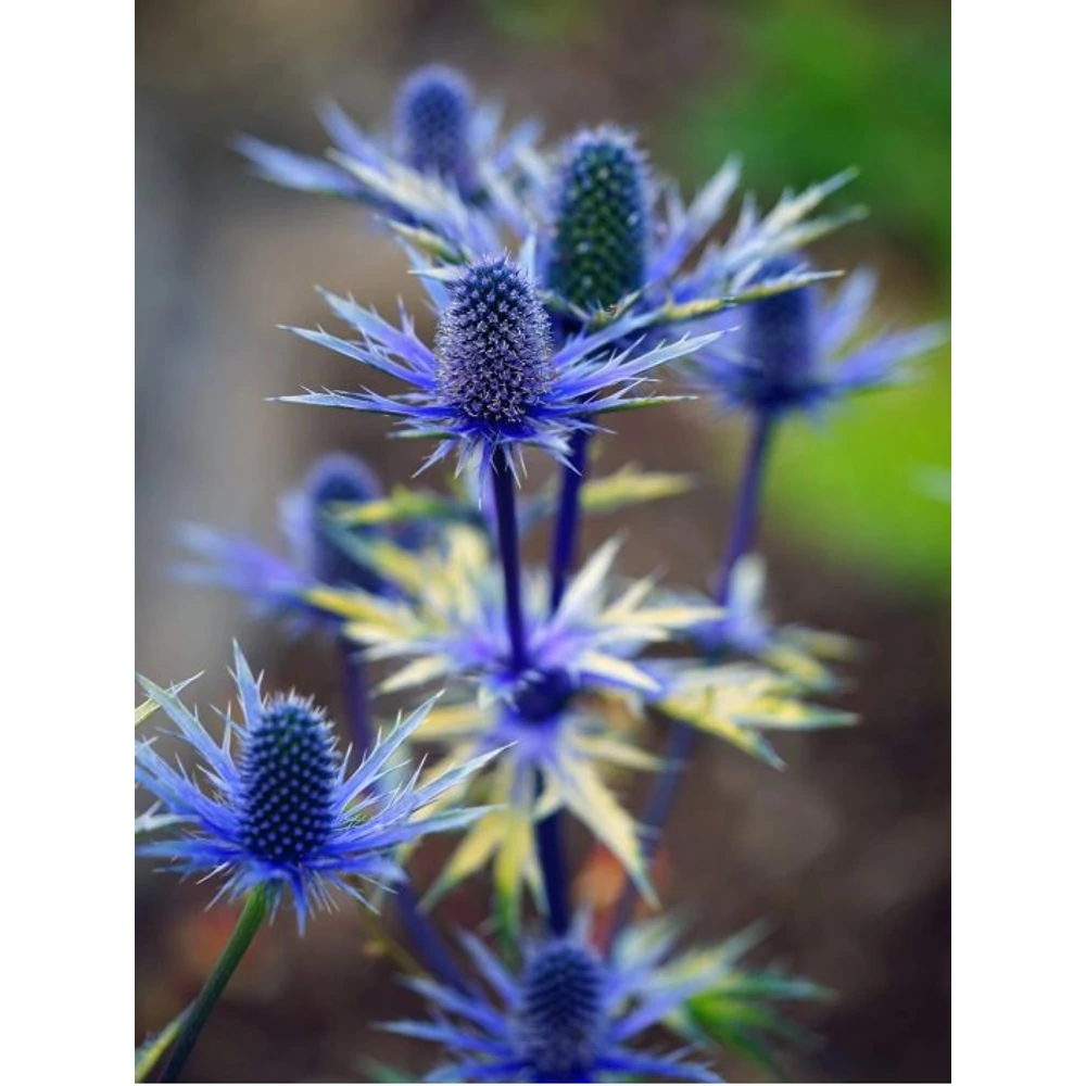 - Megjelenés: A növény 60-90 cm magasra nő, merev, felálló szárakkal. A virágfejek kúp alakúak, bogáncsszerűek, és egy finoman osztott, puha tapintású, gallérszerű fellevelek övezik. A virágok és a felső szárrészek egyaránt élénk, fémes kék színűek.