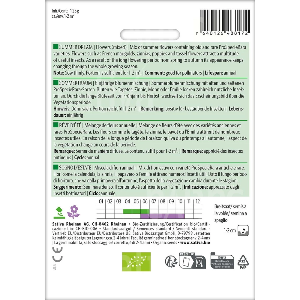 Nyári virágok keveréke, amely régi és ritka ProSpecieRara fajtákat tartalmaz. Az olyan virágok, mint a francia körömvirág, a cinnia, a pipacs és a bojtos virág, számos hasznos rovart vonzanak.